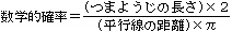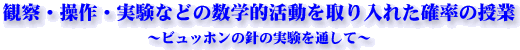 1.はじめに 確率の指導においては、統計的確率と数学的確率の両者の意味を理解させることが大切である。しかし、自分自身の指導を振り返ってみると、順列・組合わせを使って形式的に計算できるようにさせることに重点を置いていたように思う。そこで、観察・操作・実験などの数学的活動を生かした授業構想及び授業実践を行った。その結果、統計的確率と数学的確率の両者の関連を踏まえた意味理解が深まった。また、発展的な題材「ビュッホンの針」の解決を通して、確率の有用性に気付かせることができた。 本稿で、その実践の一端を報告する。 2.授業実践 ◎単元名 「確率」 ◎単元目標 具体的な事象についての観察や実験を通して、確率の意味を理解し、簡単な場合について確率を求めることができる。 ◎指導観 自然現象や社会現象に多くある不確定な事象の考察においては、それらの事象の起こる程度に着目し、確率という形で把握し表現することが有効である。また、本単元の学習を通して養われる確率的な見方や考え方は、将来学習する確率・統計分野の数学の内容の理解に重要な役割を果たす基礎的な内容である。旧学習指導要領での自分自身の指導を振り返ってみると、順列・組み合わせを使って形式的に計算する指導に重点を置き、実験・観察による確率の指導は軽く扱ってきたように思う。 よって、本単元では、観察・実験・操作などの数学的活動を通して、「起こり得る場合の数をよく整理すること」及び「統計的確率と数学的確率の両者の意味を理解させること」を理解させるとともに確率的な見方や考え方の基礎を培いたいと考える。 ◎指導計画(11時間扱い)