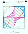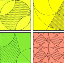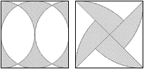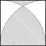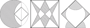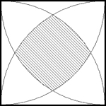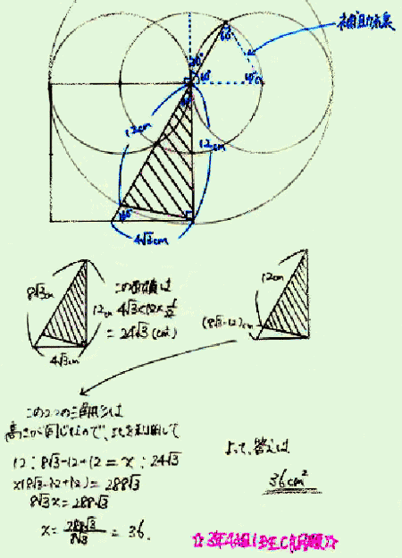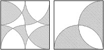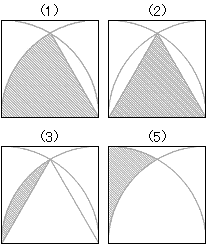 1辺12cmの正方形に,コンパスや定規を用いて線を加えることでできる図の斜線部分の面積を求める。