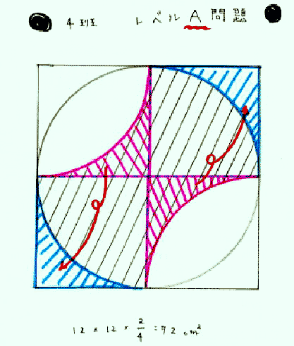 「1辺12cmの正方形に,コンパスや定規を用いて線を加えることでで きる図の斜線部分の面積を求める」問題を自分で作る。