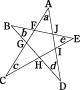 右の図のように5つの点A,B,C,D,Eがある。点Aから左回りに1つとばしで点を順に結んでいくと星形五角形ができる。その内角( a〜 e)の和をいろいろな方法で求めてみよう。