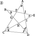 三角形の外角の関係を使い,5つの内角を1つの三角形に集めて考える生徒が多い。 |