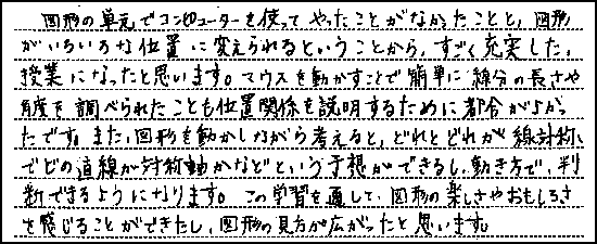 | シ. | 最初はみんな同じ図形だったけれど,動かしながら観察したら,それぞれが違う動きをして驚いた。でも,動かしながら観察することで,三角形同士の位置関係は変わらないことがわかった。 |