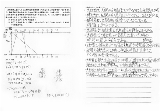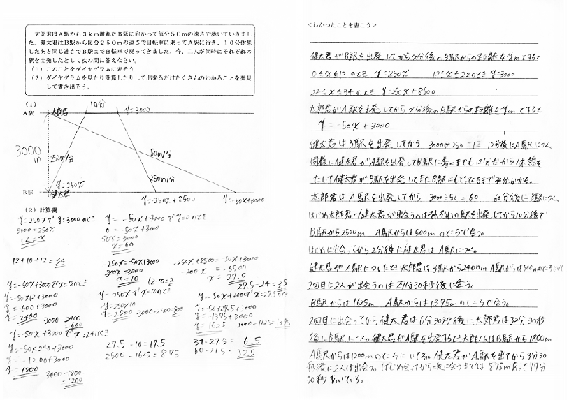 <生徒が作成したプリント> 4. 指導の成果と今後の課題 第1時の「列車のすれ違い」問題は生徒の興味を引いたようで,ほとんどの生徒が前向きに取り組んでいた。そして,その解答手段として,ダイヤグラムの有用性は十分理解させることができたように思う。 また,ダイヤグラムを利用することにより,距離と時間についての問題を整理して表現できることについては,かなりの生徒が理解できたようである。しかし,もともと関数領域に苦手意識を持っていたり,時間・距離の問題が苦手であるといった生徒は,最初から興味を示さなかったということもあった。グラフや連立方程式という問題に対して苦手意識を持った生徒に対して,どういうふうにアプローチしていくかが今後の課題だと思う。 第2時で,生徒からは「意外と多くのことを発見できた」「ダイヤグラムを見ることで,何を調べられるかということが予想できた」といった感想を聞くことができた。しかし,生徒によって温度差が大きく,発見した項目が多い生徒では,十数項目に上ったのに対して,ほとんど見つけられなかった生徒も存在した。ただし,この問題(オープンエンド)に対しては,いわゆる数学嫌いの生徒の中にも,興味を持って取り組んだ生徒もあったり,逆に普通の一つの答えを求める問題ではすぐ取り組む生徒が,何もできずに苦しんでいたりと,普段の数学の授業とはかなり様相が変わったものとなった。 こういう取り組みで数学に対する見方や考え方が変わる生徒が,一人でも増えることを望んでいる。 〈参考文献〉 平成12年度用「新訂数学1年・2年」(啓林館) |