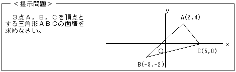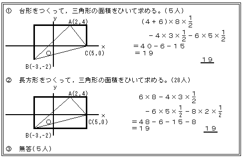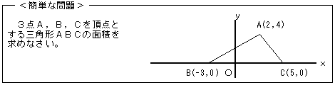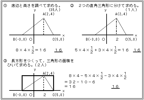このような問題は,長方形をつくり,長方形の面積から三角形の面積をひいて求められそうだ。 |