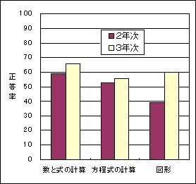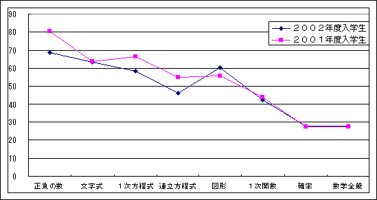 以上の定理について,一つ一つの定理について類題をたくさん集めたプリントである。 次のプリントは,上記 その他の種類のプリントは,省略させて頂きます。 授業では生徒が,数種類の定理別プリントを自分で選択させ,同じプリント同士のグループ学習として取り組んだ。選択授業でも活用した。 下のグラフは「基礎学力テスト」(年度初めに実施するテスト)における,2002年度入学生と2001年度入学生の3年次の比較である。相対的には2001年度の学力が高い中にあって〈図形の単元の部分のみ特に高い正答率だった〉ことがわかる。