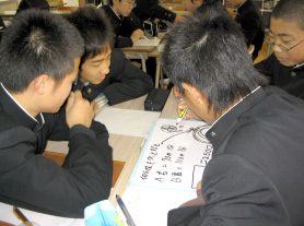 1.はじめに 基礎・基本の定着を図り,確かな学力の育成を図っていくには,生徒一人一人が学習内容に興味・関心を持ち,授業に参加しているという自己存在感を味わうことができる数学の授業を創っていくことが大切である。そこで,生徒が学習内容を理解し,わかる・できる・楽しいと感じる授業とは,学習規律が確立しており,集団の中で生徒同士がお互いのよさを認め合い学び合う場面のある授業と考え,生徒の対話による交流活動や発表を大切にする授業づくりに取り組んでいる。本校では,平成13年度より少人数授業に取り組んでおり,通常の授業に比べて,生徒の発表(自分の考えを伝える)のチャンスも多く,教師の指導も行き届きやすい環境にある。今回の実践記録は,1年生の「方程式の利用」において習熟度別少人数学習を行ったときのものである。 2.実践内容 (1) 単元の指導観「方程式」は,小学校段階で○や△に当てはまる数を考えたことのある生徒にとって,比較的取り組みやすい内容である。しかし,前単元の「文字の式」の理解が不十分な生徒にとっては,文字を使って表されている方程式は苦手意識を持ちやすい単元であるので,導入段階での丁寧な指導が必要と考えられる。 指導にあたっては,単元の導入段階である「方程式とその解」「等式の性質と方程式」では,具体物を多く使い,具体から抽象への操作活動を繰り返しながら,文字を用いて式をつくることや等式の性質を使った方程式の解法を十分に理解させる。「方程式を解く」段階から,基礎・基本の定着を図るために,一人一人の学習のペースにあわせた習熟度別少人数学習を取り入れる。少人数学習では,前時までの学習確認テストの結果と本人の希望を前提として,習熟度に応じてチャレンジコース(基本)とトライコース(応用)の2コースに分ける。 チャレンジコース(基本)では,学習プリントを使って,文字の式の定着が不十分な生徒のために「方程式をつくる」過程がわかるように,また,「方程式の解き方」では項を整理して解が求められる過程が見えるように工夫して,生徒の理解の定着を図る。「方程式の利用」段階では,まず具体物から言葉の式をつくり,次に方程式をつくるという丁寧な操作活動によって指導していく。文章を読んで,適当な図や表,言葉の式などで表現させ,思考の過程が残るように学習プリントを工夫する。 トライコース(応用)では,基本コースの内容を踏まえて指導を行うとともに,自分で方程式の計算問題や文章題をつくって班員どうしで解き合ったりして,理解の幅を広げる手立てを仕組む。また,自分の考え方を班員や全員の前で発表させ,わかりやすい説明や筋道の通った説明の仕方を学ぶ場面を多く作っていく。自分の考え方や説明が認められることによって,数学を学ぶことのおもしろさやもっとやってみたいという意欲を喚起していきたい。 どちらのコースでも,ペア学習やグループ学習を行う。お互いを認め合い・高め合いながら学習を進めていくように,生徒同士が学び合う学習形態を工夫する。 (2) 指導計画(全11時間)