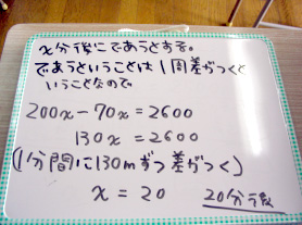 (3) 本時の指導観 本時は,この単元のまとめとして,基礎・基本の確実な定着とそれぞれの課題に応じた発展的な学習を,生徒のペースにあわせて進めるために,習熟度別少人数学習を取り入れる。そこで,前時に確認テストを行い,生徒自身に自分の課題はどこにあるかを確認させた上で,それぞれのコースの内容を提示し,チャレンジコース(基本)とトライコース(応用)に分ける。 チャレンジコース(基本)では,基礎・基本の定着を図るために,事前に自分のつまずきを確認させたうえで,身近な問題から取り組ませる。そこで,より考えやすいように,生徒の生活場面で使われることの多い人数や代金の問題を中心に用意する。そして,生徒が具体的に図や表で表すとともに,それを言葉の式で等式として表せるように指導を行う。特に,等しい関係が見つけられず方程式をつくることができない生徒には,ペア学習を取り入れ,具体物を操作させ,お互いの考えを出し合いながら,文章の中にある2つの等しい事柄を見つけ出させる。計算が苦手な生徒には,個別指導を行い,移項の仕方など機械的操作によって計算できることを身につけさせる。 トライコース(応用)では,導入段階で基本的な時間・距離・速さの関係について確認する。そして,発展学習として生徒たちの思考を揺さぶるような問題(難しそうだが,これまでの学習を活かせば解けそうだと思われるような問題)に取り組ませたい。本時では,まず池の周りを反対方向に進む問題を与え,図や表に表しながら方程式をつくり解かせる。その後,この問題の条件を変えた問題として,同じ方向に進む問題を提示する。この問題では,出会ったときの差がちょうど一周になることに気づくのが,生徒にとってかなり難しいと考えられる。そこで,班で考えさせ,お互いの考えのよさを出し合い協力して解かせたい。グループで取り組ませることによって互いを認め,数学的な見方や考え方を身につけさせたい。 両コースとも,まとめとして,自己評価カードで今日の授業の自己評価をさせ,本時の学習を振り返らせる。 (4) 本時のねらい(トライコース)
