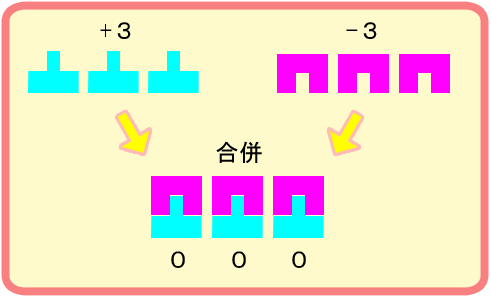 つまり,「+3」と「−3」を合体(合併)させると「0」となるということを基本として最初に確認する。 ○絶対値が同じで符号が違う2つの項は合体させると「0」ができる。