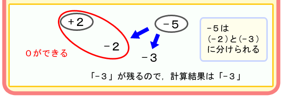 (+5)を(+3)と(+2)に分けたり,(−5)を(−2)と(−3)に分ける考え方は,生徒にとっては,あわせることよりも容易に考えられる内容である。 (6) 同符号の計算では 同符号の計算では,「0をつくることができない。」ということが大きなポイントとなる。 −5−2