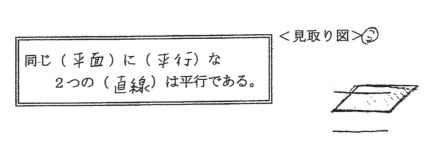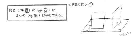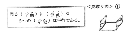 例えば,次のような図を生徒がかいていた。 例1「同じ平面に垂直な2つの平面は平行である。」について