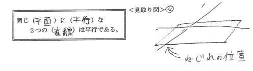 このように考えていた生徒に対しても,例1と同様に,他の生徒のかいた下の図を見せることで,「ねじれの位置」があることに気づかせることができた。