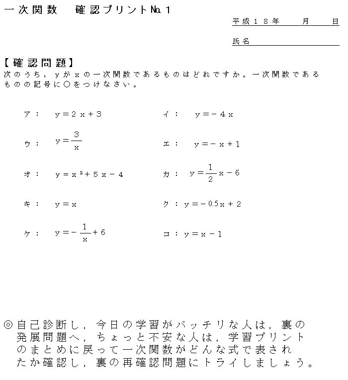 はじめは一次関数は難しそうでやる気がなかったけど,後でわかるようになったのでやる気が出た。学習プリントで理解した後,確認プリントをやるやり方がわかりやすかった。関数についてよくわかった。 |