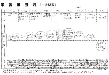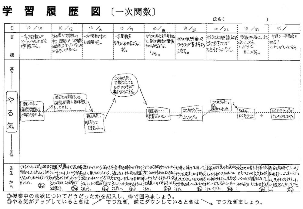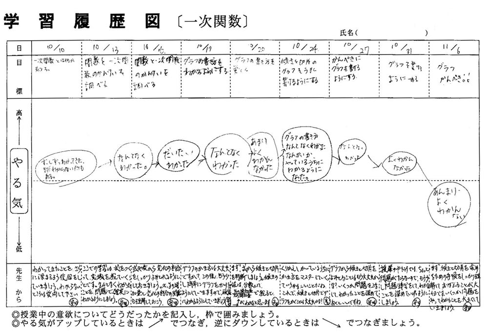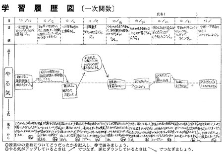 情意面の自己評価として,「学習履歴図」による自己評価を行い,1枚の紙に記録として残していく評価活動を行った。学習履歴図は千葉大学 市川洋子先生が総合的な学習用として考案したものを数学用として改良したものである。前時の授業の終わりに次時の目標を記入できるようにし,次時への意欲化を図ったり,教師からのコメントの欄を設けている。やる気が見られた授業は「上向き」に,やる気が出なかった授業は「下向き」へと進んでいる。
