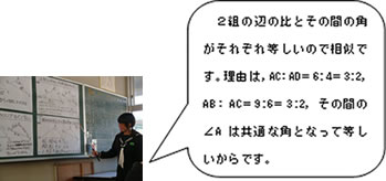 相似な三角形であることを相似条件を使って,もっと筋道を立てて説明していくものを証明といいます。次の時間から学習していきましょう。今日の感想,反省を発表しましょう。 |
