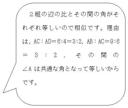 3つの三角形で,相似でない三角形の説明をもっとすれば良かったのではないか。 |