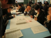 この授業は,学力向上プロジェクト事業と宇和島市算数・数学科研究委員会の授業研究会を兼ねており,宇和島市内の小学校,中学校,高等学校の教員が集まった。研究協議は,6つの少人数に分かれて,ワークショップ型で行い,意見を出し合った。 |