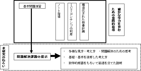 一つの単元を基礎事項の学習と問題解決型課題の学習の2本柱で授業を構成した。基本事項の学習では,既習事項の積み重ねと生徒の考えや発想に重きを置いた問題解決型課題を解決するための基礎能力の育成に充てた。