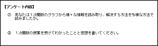 数学的用語を用いて発表する活動については,事前,事後のアンケートから「十分あてはまる,少しあてはまる」が25ポイント上昇したが全体としては67%に終わった。発表することについては,生徒一人一人の性格的なこともあるが,課題を残す結果となった。今後は発表力を今以上に抵抗なく行える指導法を研究する必要がある。