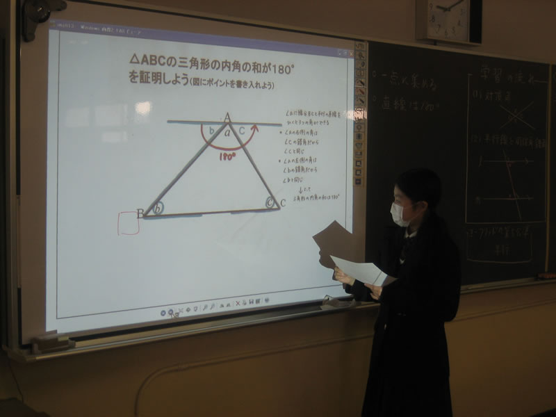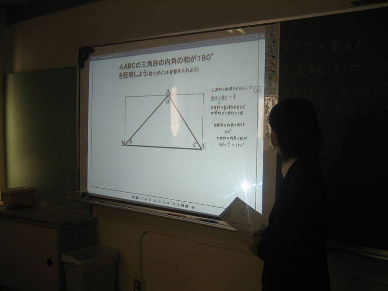 ICTコンテンツを利用した授業は,教師側にも生徒側にも多くのメリットがある。教師側のメリットは,学習課題の提示が用意である点があげられる。スキャナーで取り込んだり,作成した教材を簡単に提示できる。教科書準拠の電子黒板用教科書を用いると図形の移動,図形の回転なども容易に行え,視覚にうったえる授業が展開できる。