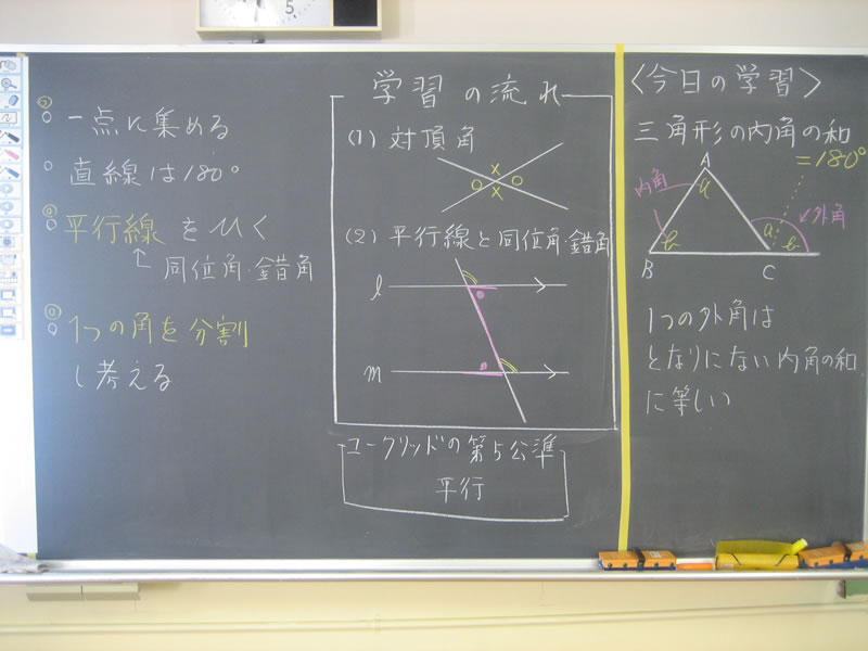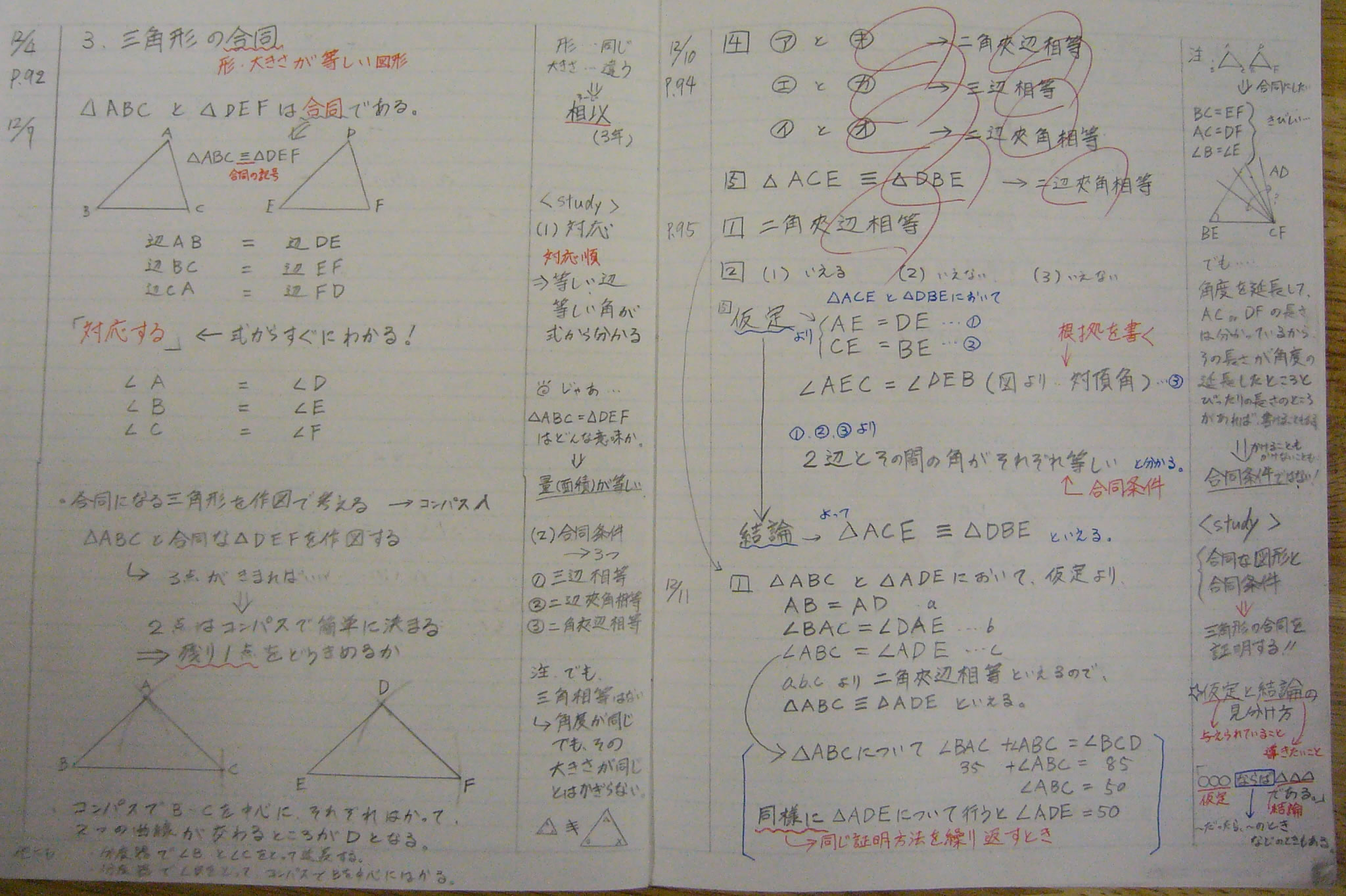 31 三角形の合同を証明するときは,3種類の条件があり,それを難しい言い方で言う言い方も習った。また様々な角度の和を求めるために平行線や内角と外角の関係など・・・色々な事を組み合わせながらより問題を早く解けるようになった。