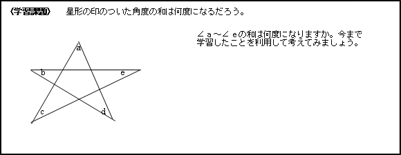 20 対頂角は等しく,また平行線の錯角,同位角も等しいことが分かった。また,どんな図形でも外角の和は360°で,内角と外角の関係を使って角度を求める方法があることが分かった。角度を求めるときは,学習したさまざまな求め方をあわせて使いながら求めることが大事だと思った。
