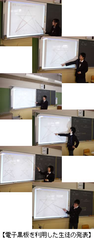 生徒にとっては,図形の移動,回転,展開図については視覚的にとらえられ直観的に理解できる。発表の際,生徒のノートや生徒が書いた授業プリントをスキャナーで取り込んだり,ウェーブカメラでキャプチャーしたものをプロジェクターで投影し発表がしやすい点があげられる。