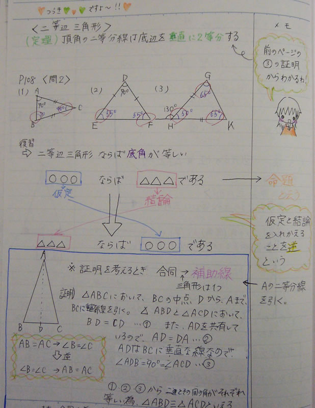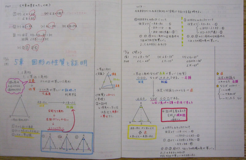 1 図形の証明は,特に難しいと聞いたことがあったけど,楽しかった。例えば,三角形の外角の求め方とかは,どうしてこうなるのかと言うことが分かって良かった。覚えることはたくさんあったけど,問題を解いているうちに分かるようになった。