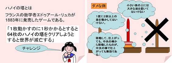| 【規則性を見い出そうと言語活動する生徒】 | 【ハノイの塔】 |