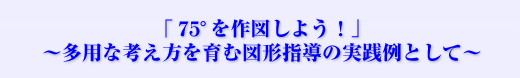 75°の作図は“45°+60°÷2”や“60°+30°÷2”など,単純な数字の組合せです。既習の作図からその関係に導く過程で,直感力や思考力などを育むことができたと考えています。また,数学的な活動の楽しさには,学んだことを活用して問題を解決し,その有用性を理解したり,友達との話し合いの中で自分の考えが認められたりする活動があります。当然,すべての生徒が自分なりの考え方を持って問題解決できたわけではありませんが,「あっ,そうか〜〜」という顔で仲間の考え方を聞く子ども達にも,数学的な活動のすばらしさが伝わっているものと思っています。