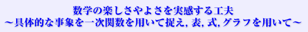 本学級の生徒は,具体的な事象から数量関係を捉え,式に表すことを比較的得意としている生徒や,じっくりと問題を考えることが楽しいと感じている生徒が多い。しかし,グラフから必要な情報を読み取って考察することや,自分のことばで表現することをやや苦手としている生徒が多い。また,何人かの生徒は,とても数学を苦手にしており,基本的な計算力が身に付いておらず,配慮が必要である。