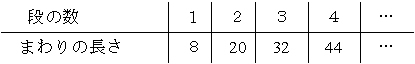 階段状にしきつめた正方形のタイルを見て,伴って変わる2つの数量について調べる活動は昔からある問題である。以前は中学1年生「関数関係の意味」を理解させる指導で扱った。あえて3年間の「関数」学習の最後に扱うことで学び直しの機会とする。