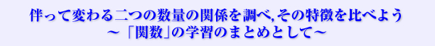 中学校数学科においては,2つの数量の関係を表や式等に表して,その変化や対応の特徴をとらえ,関数関係について調べることがねらいである。ここでは,中学校3年間「関数」の学習のまとめとして,関数関係についての理解を一層深め,事象の考察に生かそうとする態度をはぐくむとともに,関数の概念の広がりを実感させたい。