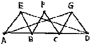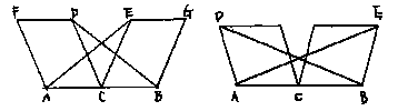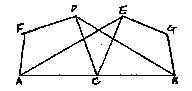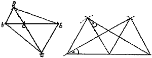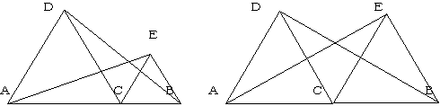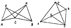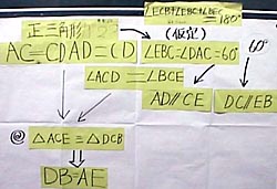 4.授業の実際 ![]() 問題に含まれる条件をつかむために一人ずつが定規とコンパスで作図した。 点Cが右よりのものと,中点のものが多く認められたので黒板に作図させた。 「辺や角に注目して,いろいろな性質を探してみよう」と発問し,たくさんの性質をあげさせた。これらを,当たり前として納得できるものと,証明が必要であるものとに分けた。証明の必要性を感じさせるとともに,課題を自分で設定できるようにしたためである。そして,条件の関係を確認しながら次表のようにまとめた。 ![]() △ACE≡△DCBの関係がいえればほとんどの性質は説明できそうだ,ということに気づいた。条件の関係がつかめたところで,自分で見つけた性質の1つを証明した。 自力で解決し,発表を通してどんな証明の方法がいいのかを全員で検討した。 この後,