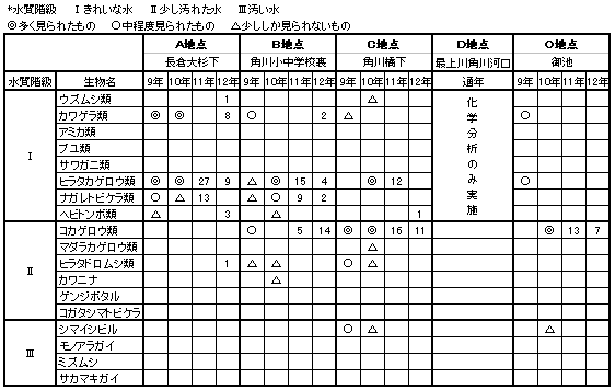 *水生生物,pH,COD,NO2,PO4,導電率のデータは,表やグラフを参照してください。