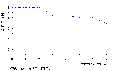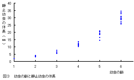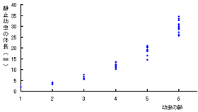 | 1) | スミレ等に生みつけられた卵を葉とともに飼育カップに入れ,孵化後の1齢幼虫から脱皮成長するたびにノギスで体長を測定する。また,脱皮した日を記録する。 |