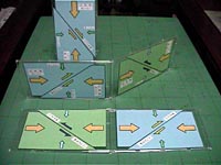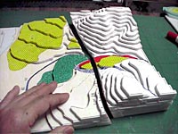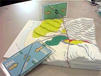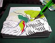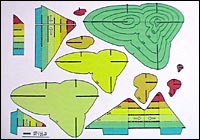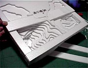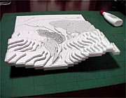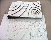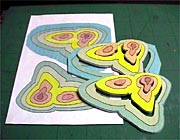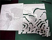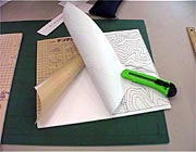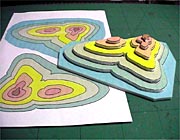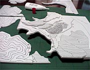 ○ | 当初は,そのページに載っていた地図を拡大コピーし,2枚の厚紙に貼り付けて制作した。今回は,タック面のついた5mm厚の発泡ポリスチレンボードが見つかったので,5.4 mmが等高線間隔の10m に一致するように図を拡大し(およそB4強),実際の起伏に近い立体化を目指した。以下に紹介するので,制作過程を写真で追って見ていただきたい。