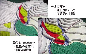 | ◆ | 授業での活用:通常の授業では制作作業はできないので,段丘面のずれが描かれた地図と,変位量に関するデーターを空欄にしたものと,逆断層や横ずれ断層の図をプリントして配布した。時間に余裕があるときは,段丘面の着色作業や厚紙に貼って断層位置で切り離して横ずれを実感させた。段丘面のずれが描かれた地図をそのまま立体化した地形モデルを提示して興味を引き,段丘崖の存在や南東側(山側)の上昇,段丘面の右横ずれ,河川の断層による屈曲,などを観察させるようにした。活断層でずれていった方向をモデルを使って確認させ,2万年で20m右へずれ10m上昇したことから千年あたりの変位量を計算させた。そして,教科書の写真(p.108)から,今回の地震の変位が2千年間のひずみの蓄積の結果動いたことと調和的であることを実感させた。