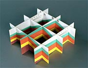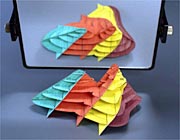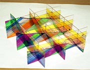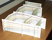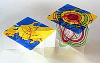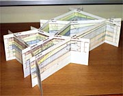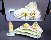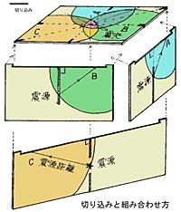 これらの筆者が開発したモデルは,いずれも安価な厚紙や塩化ビニル板を差し込んで組み立てる簡易な立体で,視点の移動が簡単で立体物の認識の大きな手助けとなり,しかも分解すれば収納が簡単であるという,多くの利点を備えた教材である。 ところで今回ここで紹介するのは,「地震と断層」関係にまとを絞って新たに開発した手作り実習教材である。併せて,授業での活用例も紹介することにする。実際にモデルを作ってそれを手に取ってみると,そこから思わぬ発見が生まれるてくることがある。 2.簡易な地震立体モデルの制作 いずれもパネル化して作る立体の応用例で,上面の地表を表す半透明なパネルを下の2〜3枚のパネルで支えたものである。 地震の等発震時曲線モデル