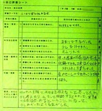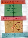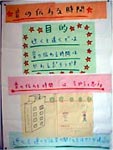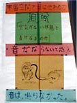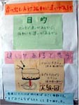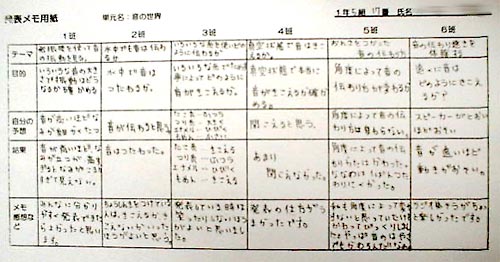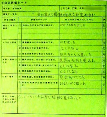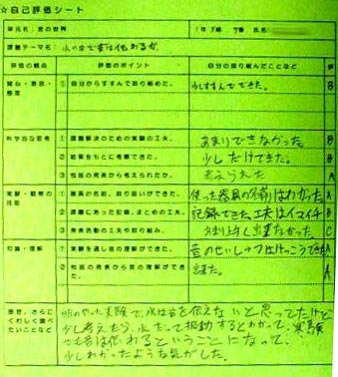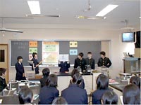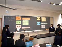 自分たちの課題解決の実験の発表を行う。カードを黒板に貼り、発表原稿を読みながら実演(Show&Tell)を交えて行う。本校の理科室の構造上、後方の生徒は発表を見づらいため、演示実験台前に椅子を並べて発表を見聞する。発表に際しては、「総合的な 学習の時間」に行ったスキル学習(発表のしかた、話し方、機器の扱い方など)を利用する。実験内容や考察だけでなく、発表のしかたについても生徒に質疑、感想、アドバイスを求める。 |