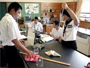 昨今は,コンピューター技術の発達により,学校現場にもコンピューターがたくさん導入されている。また理科の実験においてもセンサーを使った実験などコンピューターに関わるものが増えてきたように感じる。しかし,原点に立ち返り,実際に手にとって観察実験ができるような教材としてモデルを使った授業を展開してみた。この実験に関しては,たくさんの先生方に手伝ってもらいながら実施することができた。このようにして教師が実験を工夫することにより,生徒は興味深く取り組むことができるし,今,言われている理科離れを減らしていくこともできると考える。生徒は緊張しながらも一生懸命実験に取り組んでいたことも良かったと思ったことである。今後とも,生徒が興味関心を深め,自ら何かを解決しようと思えるような実験を考えていきたいと思う。
