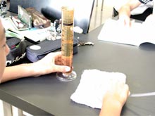ペットボトルの口につないだビニル管をまっすぐ伸ばす。
