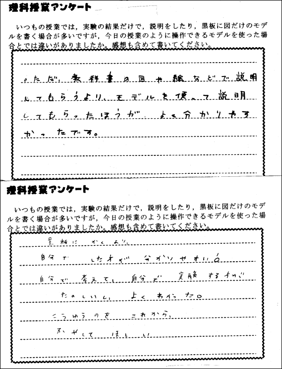 今回の研究の成果としては,使用時期を考えることにより,同じモデルでも違う実験に使え,生徒に考えさせることができた。