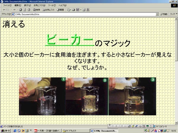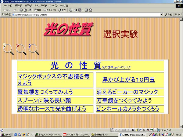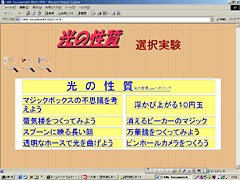 | (3) | ネット上にのせることで,地域教材の活用など情報の共有・公開性に優れ,ネットを通して地域の教員による共同の教材作成(リンクをはる分散型とソフトを次々に追加し一つの教材を作るタイプ)が可能である。 |