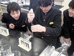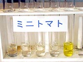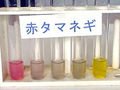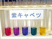 生徒たちは,持参した野菜などを使って目を輝かせて実験に取り組んだ。しかし実験3で,色水がBTBなどと同じ指示薬になっていることを理解できずに,持参した液体を5本の試験管に分け取り,それにpHの異なる5種類の水溶液を加えている班もあった。