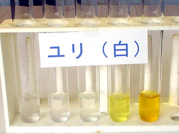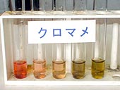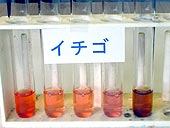 結果(写真の一番左側の試験管から右へpH2,4,7,12,14の順)