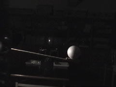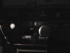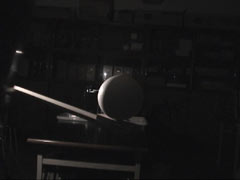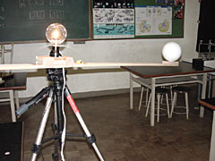 細長い板に,直径15cmの発泡ポリスチレンの球と60W電球を取り付け,その板をカメラの三脚にねじで固定した。