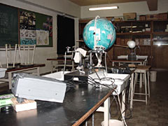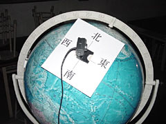 地球儀の日本の位置にCCDカメラ(Webカメラ)を取り付け,日本から金星を見るとどのように見ることができるのかを説明するのに使った。その際,金星がどちらの方角に見えるかがわかるように東西南北の方位を書いた紙も貼った。