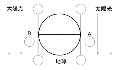 | ◇ | 図1の地球の夜の部分は黒に,昼の部分は黄色に,色鉛筆でうすくぬりなさい。
