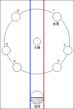 | ◇ | 図3に,図2の1,2,3,4,5,6の位置のときの金星の満ち欠けのようすを色鉛筆でかきなさい。