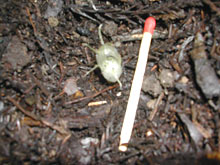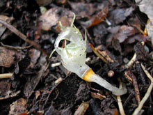タヌキノショクダイは,地表まで出てくることはなく,落ち葉の下10cmぐらいの湿った腐葉土に生えていた。成育中に,風で上にあった落ち葉が飛んでしまったもの(写真)があったのだが,その後,何回見に行ってもこれ以上大きくならなかった。このことからわかるように,成長期には,特に湿り気が必要であると考えられる。 |